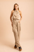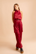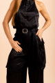 Macacão frente única em tecido acetinado. Possui gola americana, fechamento em botões forrados na vista, elástico na cintura, cinto com passante metálico, e calças de modelagem ampla com bolsos laterais.